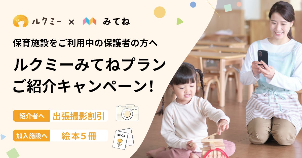 保育施設が利用料無料※2で写真販売や連絡帳等を利用できる「ルクミー みてねプラン」について、お子さまが通園する保育施設にご紹介いただくと、紹介いただいた保護者と契約いただいた施設の両方に特典をプレゼントするキャンペーンを2024年11月15日(金)より開始しております。