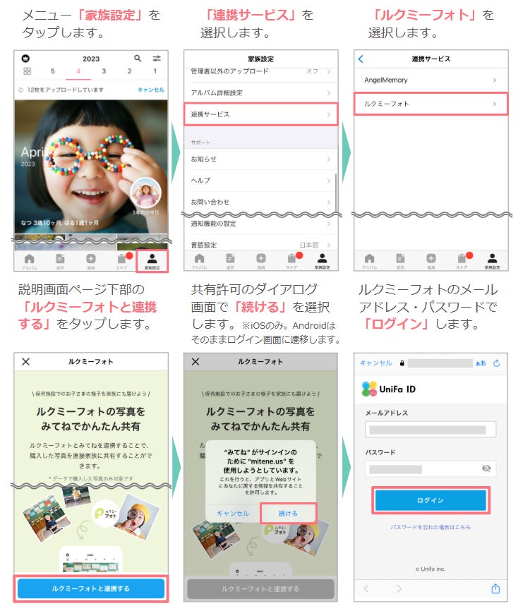 なお、写真データの連携にあたっては「みてね」スマートフォンアプリをインストールの上、「家族設定」→「連携サービス」より「ルクミーフォト」を選択の上、連携開始をお願いします。